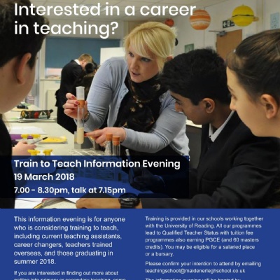 Come and find out more about primary and secondary teaching at the 'Train to Teach Information Evening' run by Berkshire Teaching School Alliance on 19 March 2018 (7.00 - 8.30pm). This event will be hosted at Maiden Erlegh School.