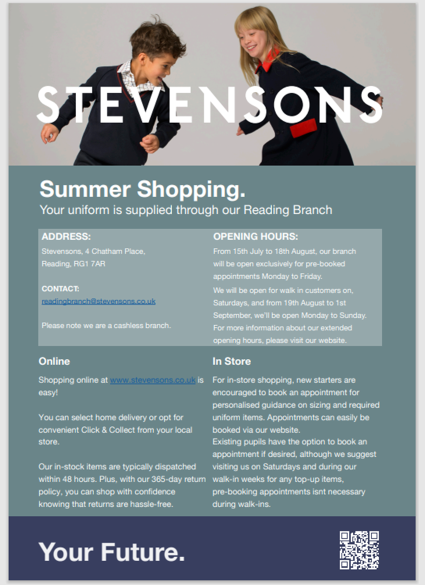 Stevensons can supply all your school uniform needs through the Reading Branch, located at 4 Chatham Place, Reading, RG1 7AR.  More details about store opening times and in-store or online shopping, can be found below or please visit the Stevensons website at: www.stevensons.co.uk