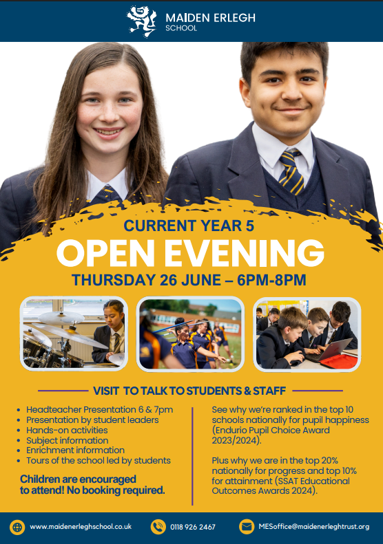 Please find information below about our Open Evening taking place on Thursday 26 June from 6pm-8pm at Maiden Erlegh School, Silverdale Road. This Open Evening is aimed at those students who are currently in Year 5 of Primary School.