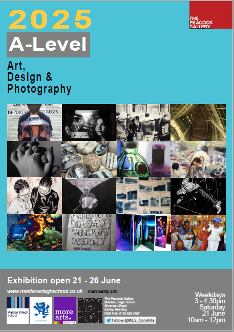 We are happy to invite you to the A-Level Art, Design & Photography Exhibition taking place from 21 - 26 June in the Peacock Gallery at Maiden Erlegh School, Silverdale Road. The Exhibition is open weekdays from 3pm - 4:30pm and Saturday 21 June from 10am - 12pm. Please find more information below.