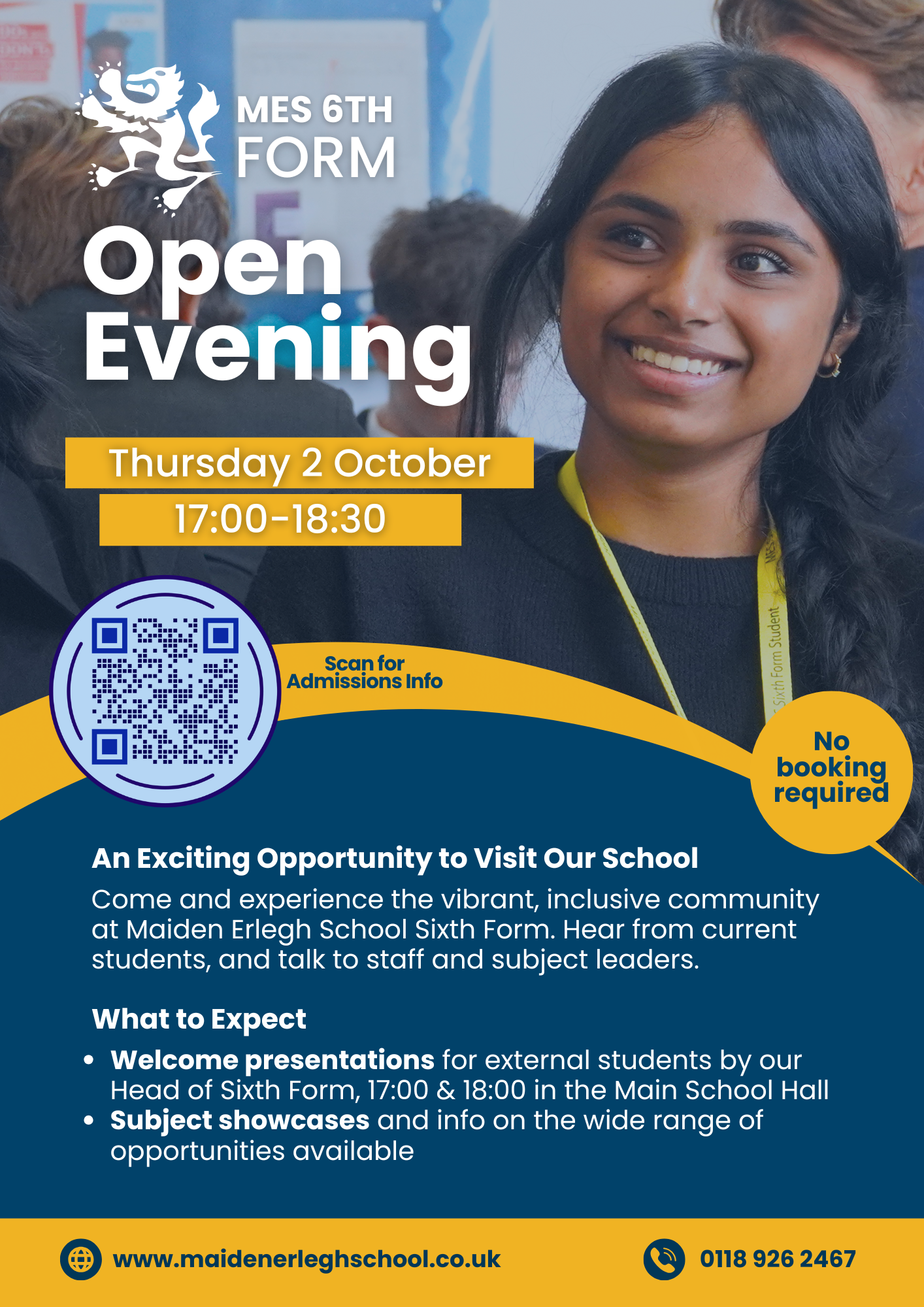 We are delighted to invite you to the 6th Form Open Evening on Thursday 2 October from 5.00pm to 6.30pm.