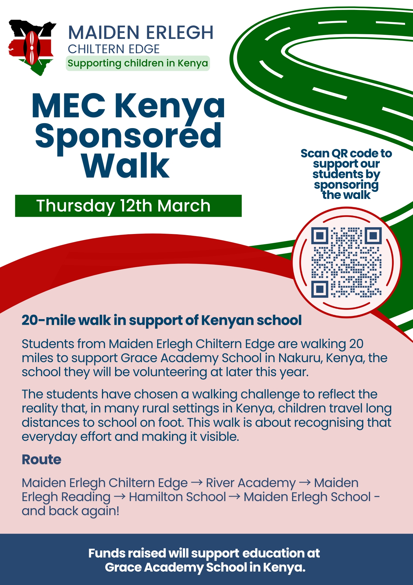 Students from Maiden Erlegh Chiltern Edge will be passing through Maiden Erlegh School as part of their 20-mile sponsored walk to support Grace Academy School in Nakuru, Kenya, where they will be volunteering later this year.